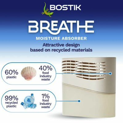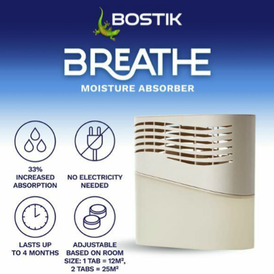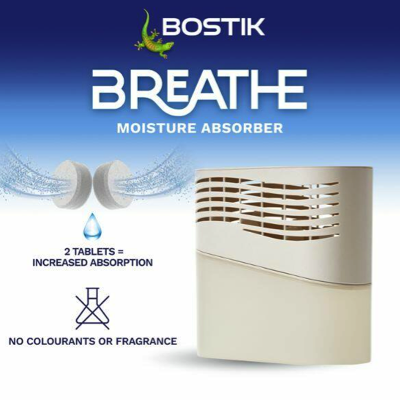 Bostik Breathe is a small, silent, air dehumidifier, designed to absorb excess moisture in your home. It’s suitable for all internal humid spaces, including bathrooms, bedrooms and kitchens, as well as within wardrobes and cupboards.