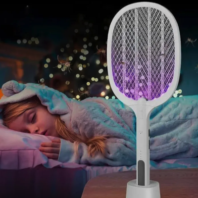 A handheld mosquito swatter in the day, a PURPLE light trap in the night.